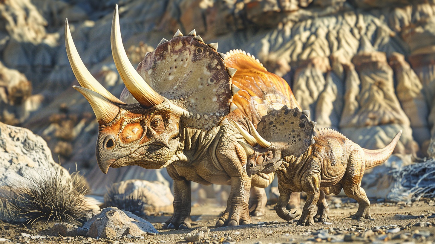 Midjourney(ミッドジャーニー)で作成したトリケラトプスの親子が描かれたフリー素材画像です。画像を購入した方は、クレジット表記やリンクは一切不要で個人・商用問わずお使い頂けます。迫力あるリアルな恐竜の写真をぜひフリー素材画像としてお使い下さい。