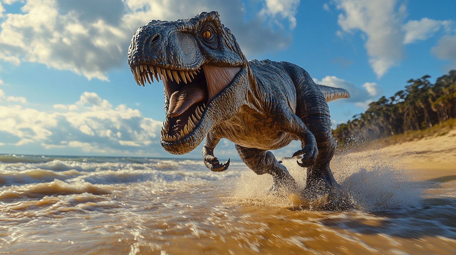Midjourney(ミッドジャーニー)で作成したビーチを走るティラノサウルスのフリー素材画像です。画像を購入した方は、クレジット表記やリンクは一切不要で個人・商用問わずお使い頂けます。迫力あるリアルな恐竜の写真をぜひフリー素材画像としてお使い下さい。
