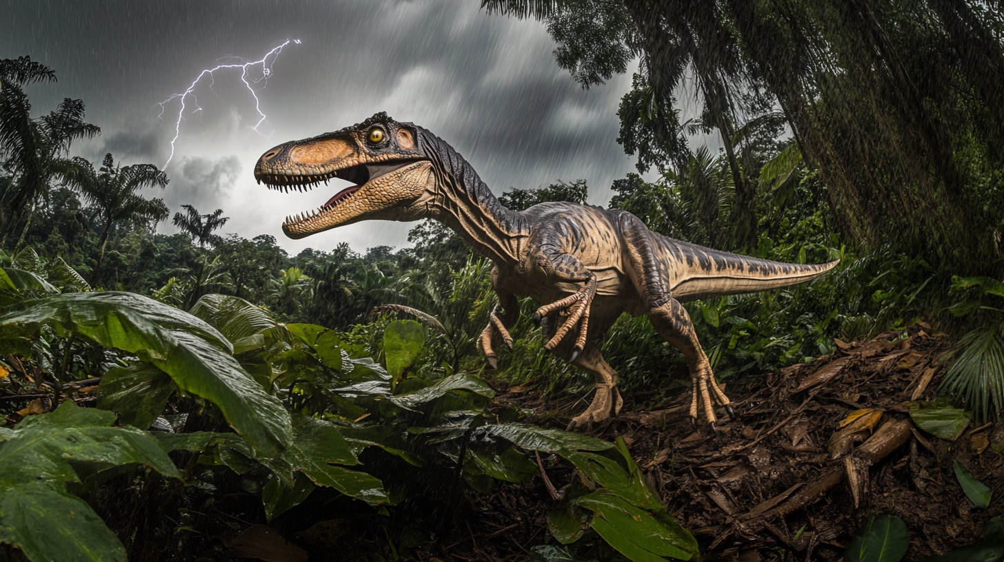 Midjourney(ミッドジャーニー)で作成した雷雨の密林を駆けるアロサウルスのフリー素材画像です。画像を購入した方は、クレジット表記やリンクは一切不要で個人・商用問わずお使い頂けます。迫力あるリアルな恐竜の写真をぜひフリー素材画像としてお使い下さい。