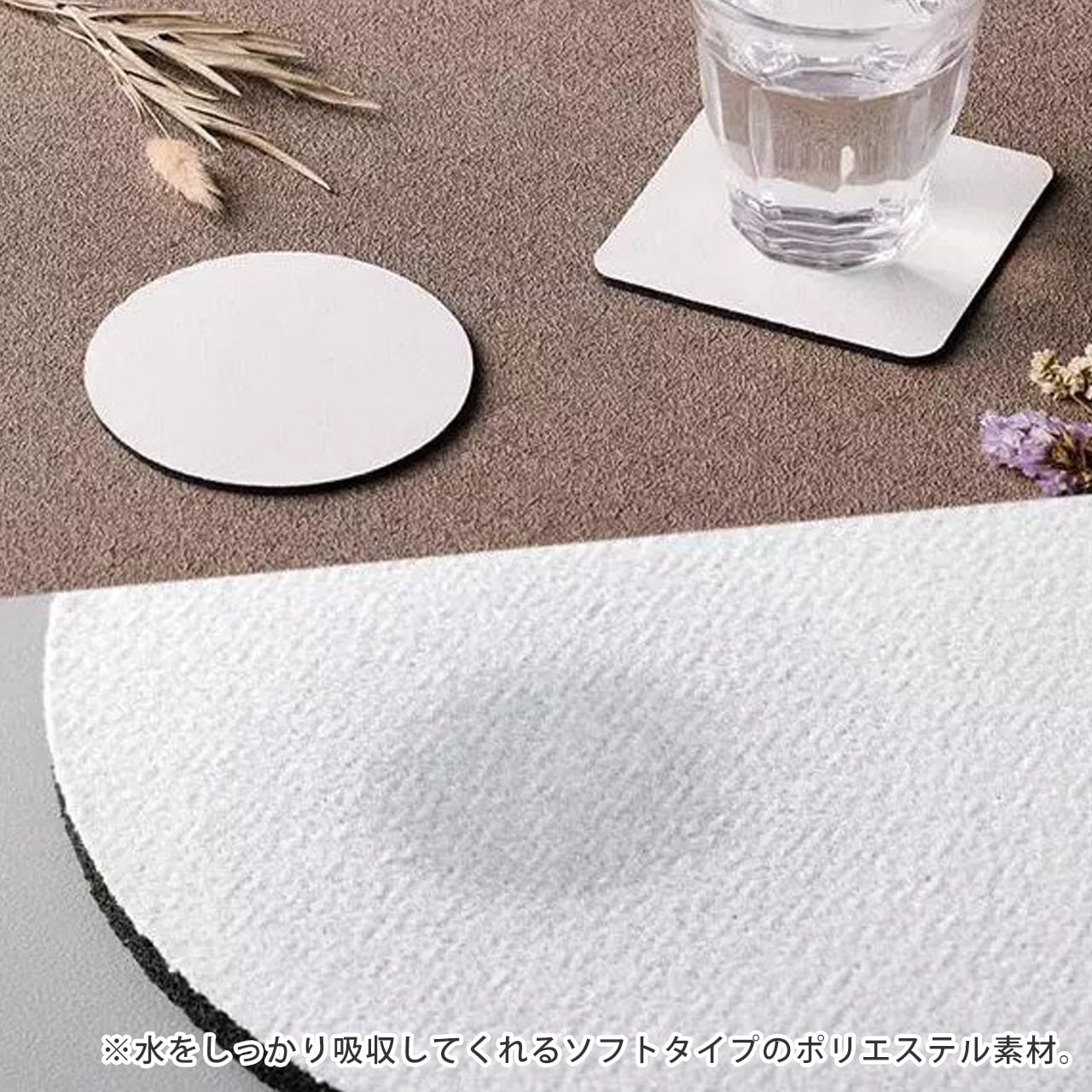 定番の丸型コースターです。ソフトタイプのポリエステル生地を使用している為、紙やラバーコースターと比べて水をしっかり吸収してくれます。裏面は滑り止め効果のあるラバー素材を使用しているのも嬉しいポイントです。