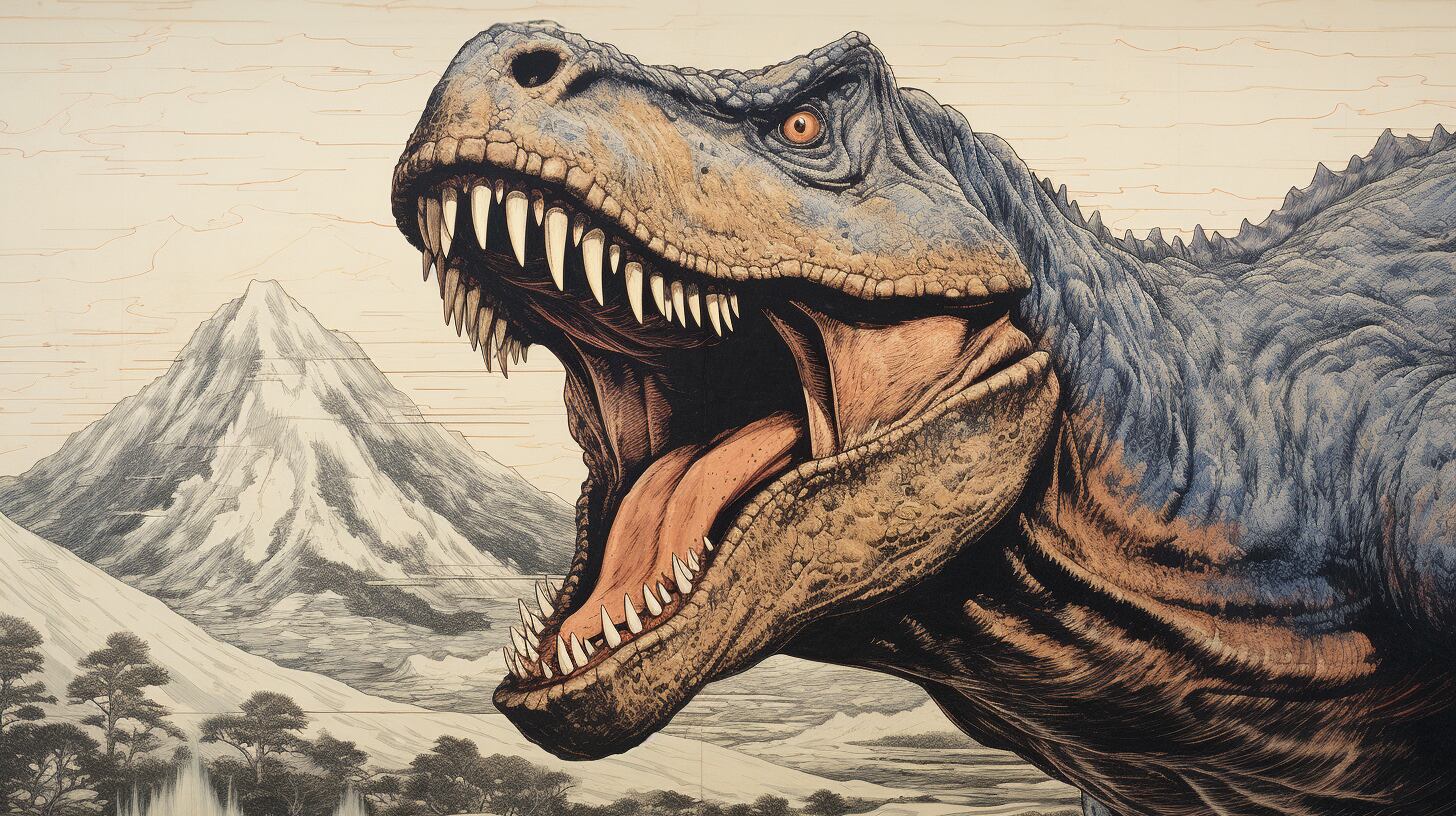 画像生成AI Midjourney(ミッドジャーニー)で創られた、浮世絵スタイルのティラノサウルスです。画像を購入した方は、クレジット表記やリンクは一切不要で個人・商用問わずお使い頂けます。迫力あるリアルな恐竜の写真をぜひフリー素材画像としてお使い下さい。