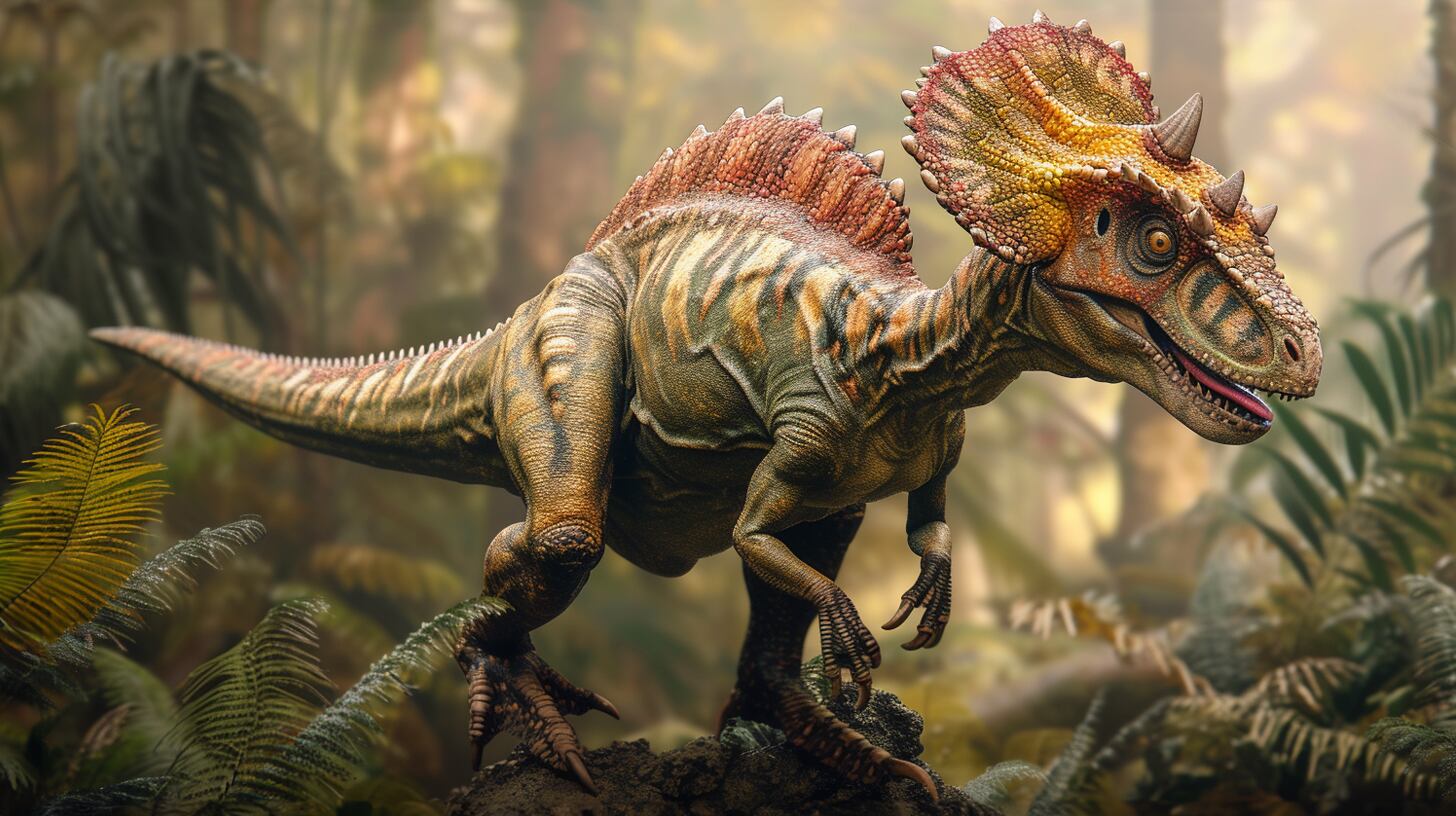 画像生成AI Midjourney(ミッドジャーニー)で創られた、緑豊かなジャングルで佇む、ディロフォサウルスが描かれたフリー素材画像です。です。画像を購入した方は、クレジット表記やリンクは一切不要で個人・商用問わずお使い頂けます。迫力あるリアルな恐竜の写真をぜひフリー素材画像としてお使い下さい。
