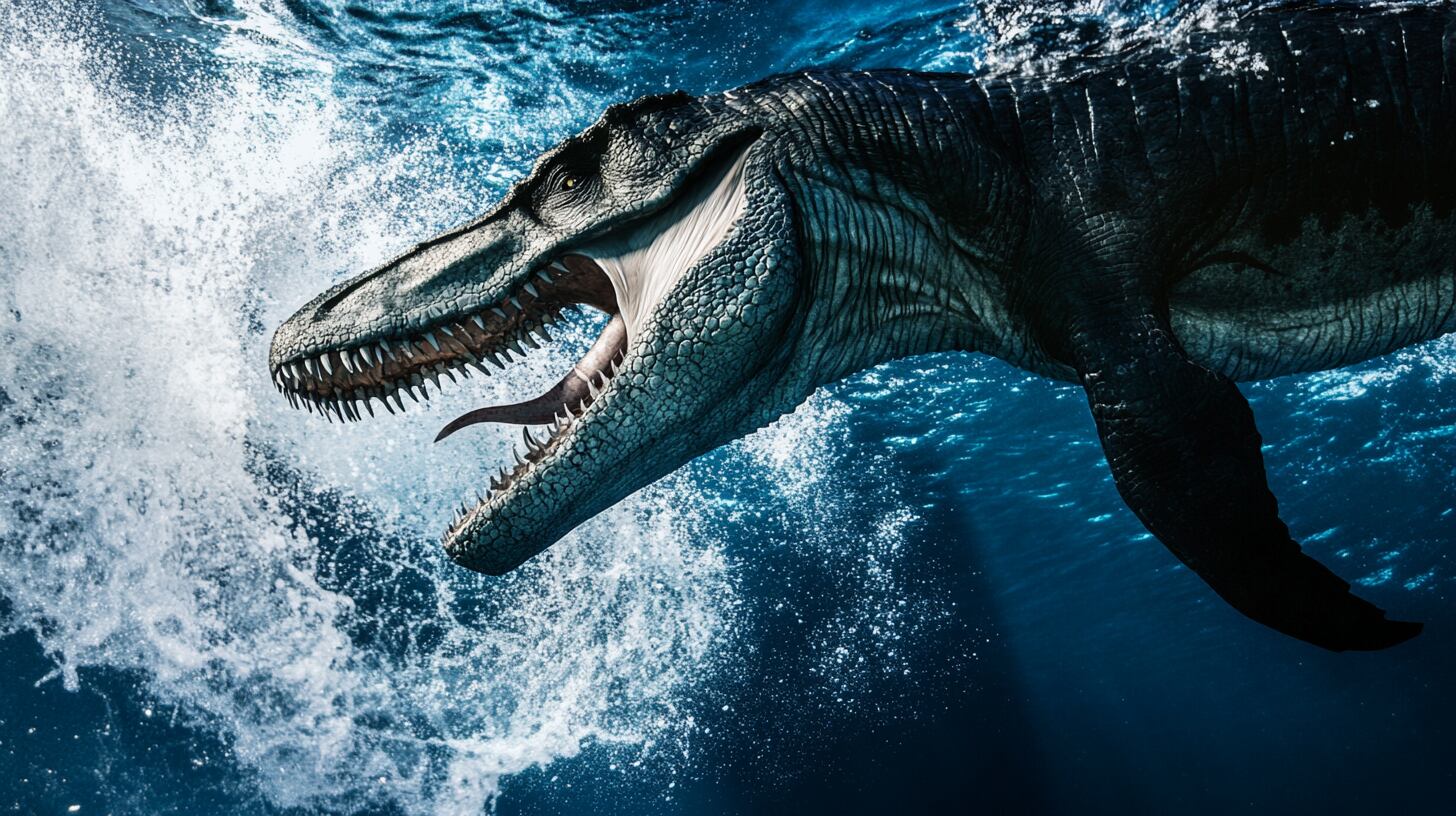 画像生成AI Midjourney(ミッドジャーニー)で創られた、モササウルスのフリー素材画像です。です。画像を購入した方は、クレジット表記やリンクは一切不要で個人・商用問わずお使い頂けます。迫力あるリアルな恐竜の写真をぜひフリー素材画像としてお使い下さい。