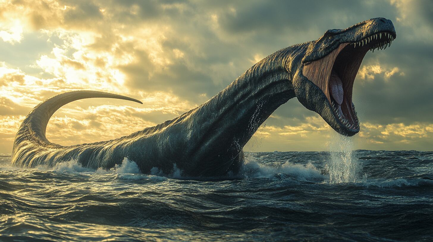 画像生成AI Midjourney(ミッドジャーニー)で創られた、エラスモサウルスのフリー素材画像です。です。画像を購入した方は、クレジット表記やリンクは一切不要で個人・商用問わずお使い頂けます。迫力あるリアルな恐竜の写真をぜひフリー素材画像としてお使い下さい。